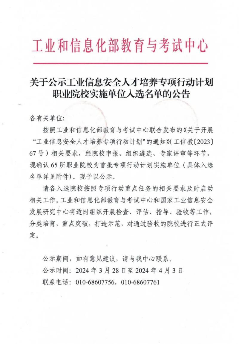 按照工业和信息化部教育与考试中心联合发布的《关于开展“工业信息安全人才培养专项行动计划”的通知》(工信教[2023]67号)相关要求,经院校申报、组织遴选(初评)、专家评审等环节,确认48所高等院校、65所职业院校为首批专项行动计划实施单位。
