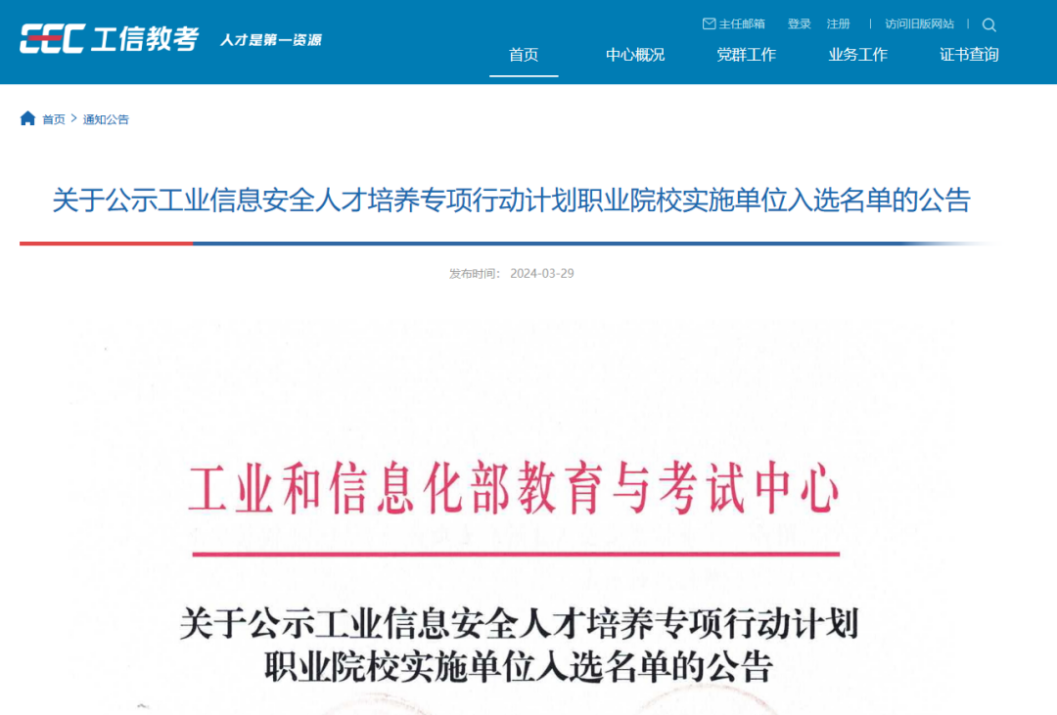 近日,工业和信息化部教育与考试中心和国家工业信息安全发展研究中心联合发布《关于公示工业信息安全人才培养专项行动计划高等院校实施单位入选名单的公告》和《关于公示工业信息安全人才培养专项行动计划职业院校实施单位入选名单的公告》。