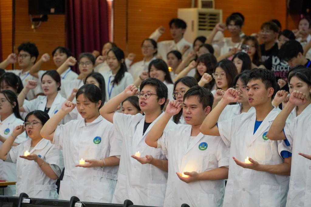 在授帽仪式上,由健康学院教师黄丹丹和梁菲菲依次为同学们戴上圣洁的燕尾帽,神圣而庄严的仪式标志着他们即将由一名护生转变为一名护士,身份不同,初心不变,信念不移。同学们庄严地举起右手,在领誓人的带领下,誓言声声回荡在报告厅内,每一位同学都神情肃穆,眼神坚定。这不仅是对南丁格尔精神的传承,更是对自己未来护理职业生涯的庄严承诺。